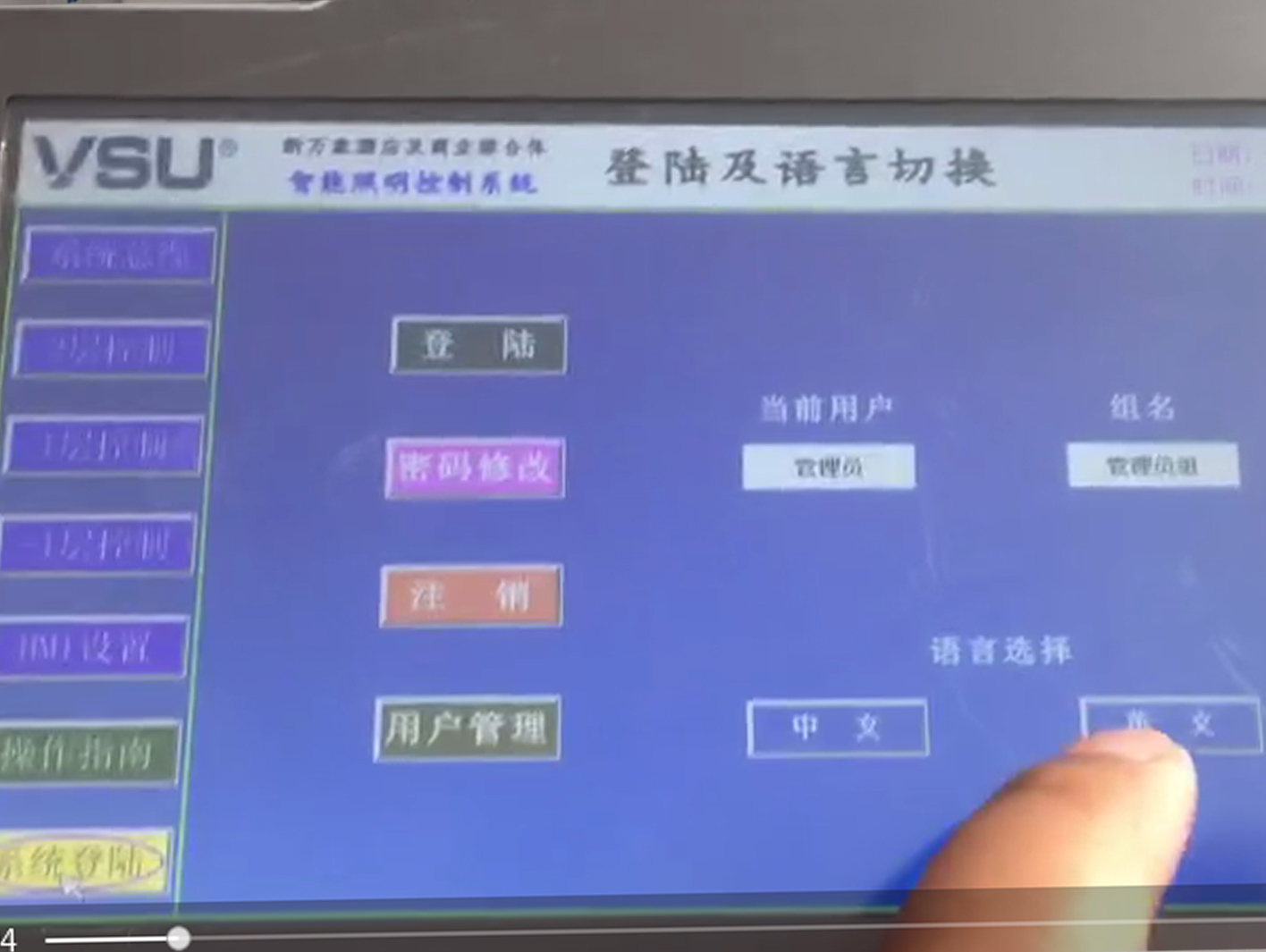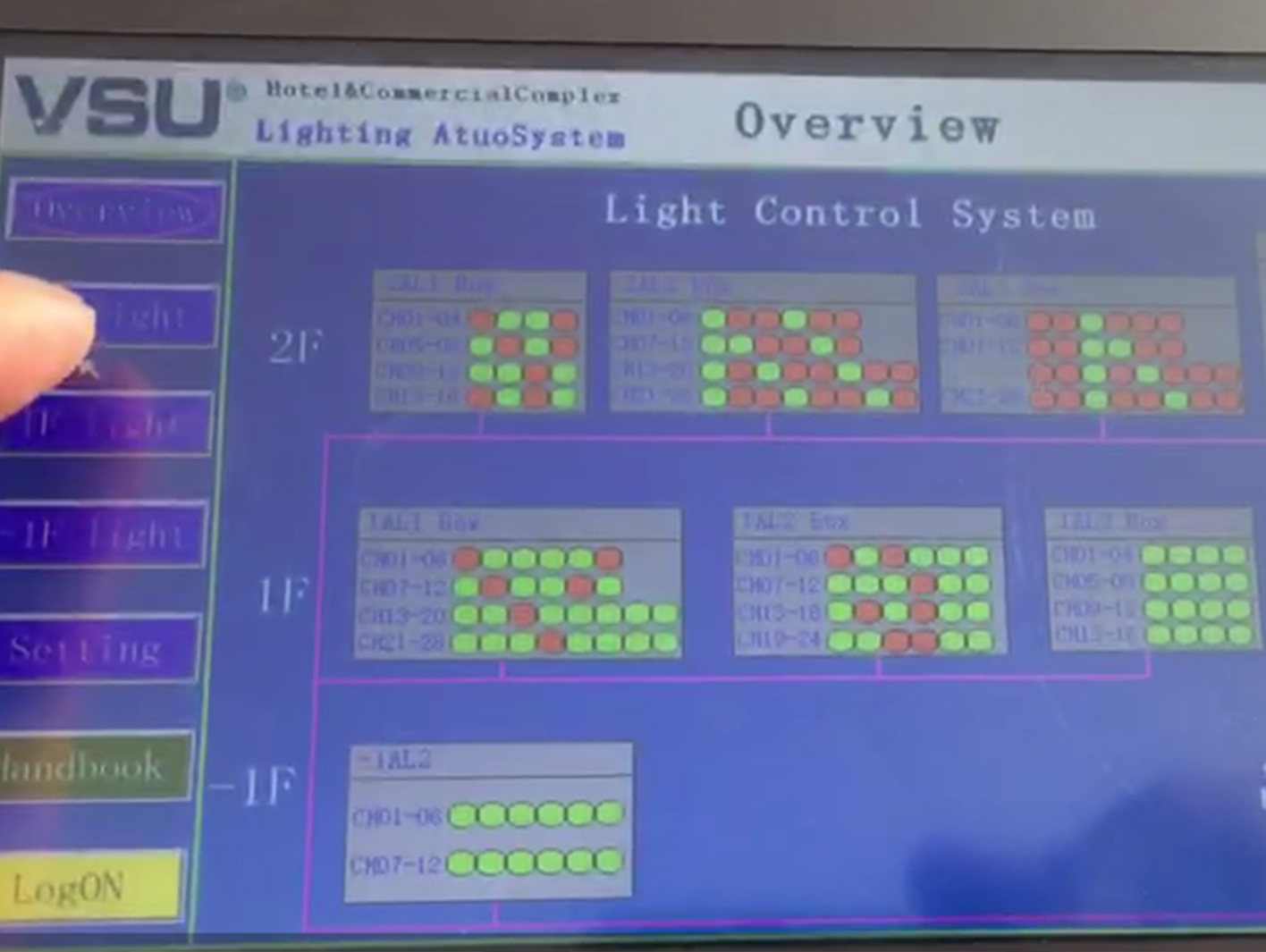 上圖為項目現(xiàn)場內的電箱圖片,產(chǎn)品采用導軌式安裝,安裝簡單,普通電工即可完成。通過現(xiàn)場的觸摸屏可對控制終端任意操作,語言選擇中文/English,燈具單控全控,遠程操控。并且可以將建筑內的燈具開關狀態(tài)了如指掌,避免疏忽管理,導致電能耗上升情況的發(fā)生。