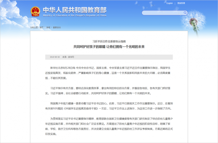 針對(duì)近年來我國(guó)兒童青少年近視率居高不下、不斷攀升,近視低齡化、重度化日益嚴(yán)重等問題,習(xí)近平總書記曾指出:我國(guó)學(xué)生近視呈現(xiàn)高發(fā)、低齡化趨勢(shì),嚴(yán)重影響孩子們的身心健康,這是一個(gè)關(guān)系國(guó)家和民族未來的大問題,必須高度重視,不能任其發(fā)展。有關(guān)方面要結(jié)合深化教育改革,拿出有效的綜合防治方案,督促各地區(qū)、各有關(guān)部門抓好落實(shí),同時(shí)強(qiáng)調(diào)全社會(huì)都要行動(dòng)起來。