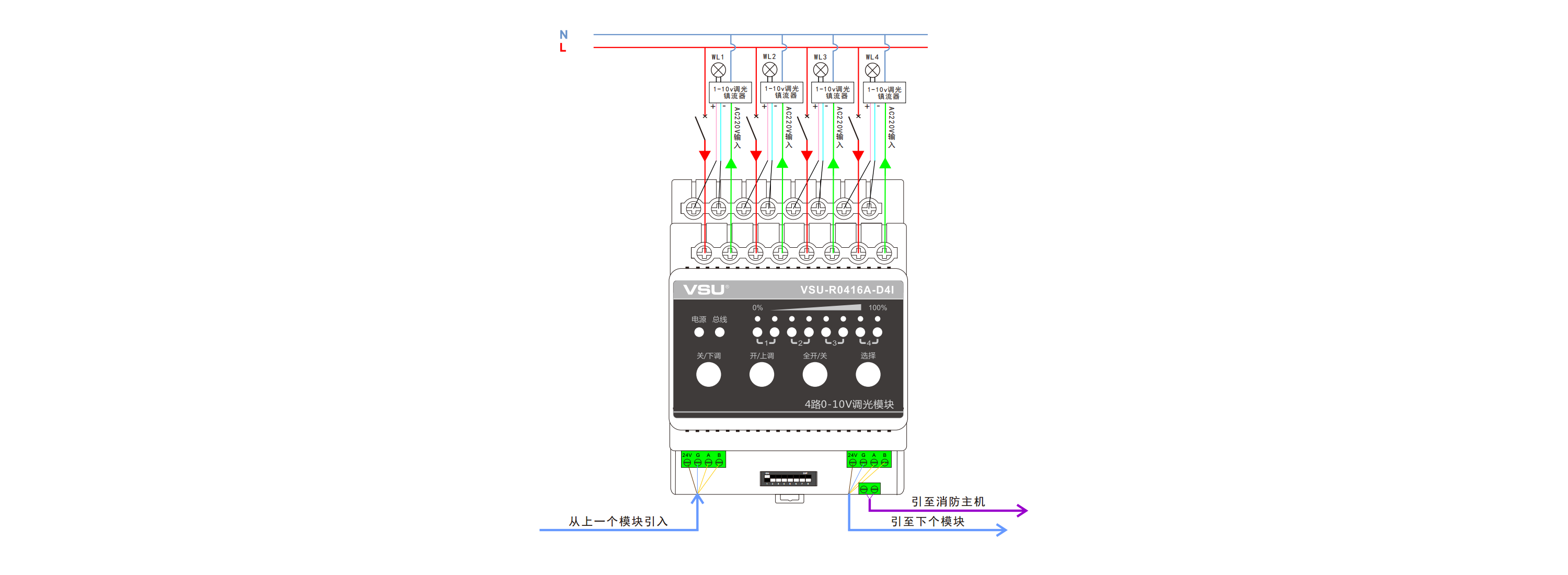 2,提供4路16A繼電器開關(guān)和4路0-10V調(diào)光信號;