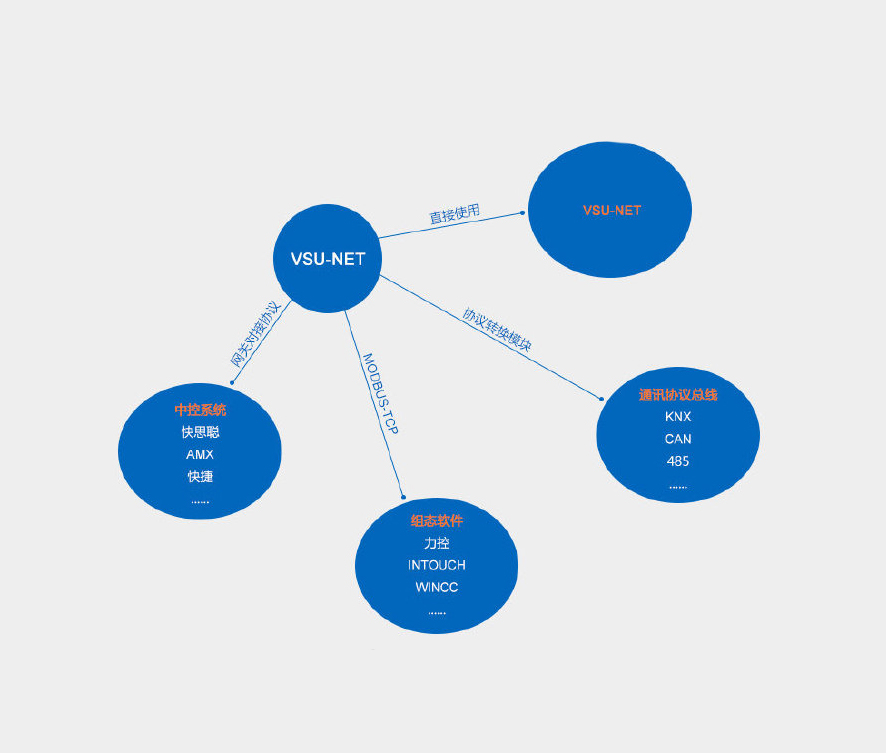 VSU智能照明控制系統(tǒng)通過自主研發(fā)的VSU-NET通訊協(xié)議可以做到單獨(dú)自組解決方案,同時(shí)也可以與市場(chǎng)上不同通訊協(xié)議的系統(tǒng)搭配,實(shí)現(xiàn)靈活多樣的行業(yè)智能化控制解決方案。 VSU的VSU-NET···