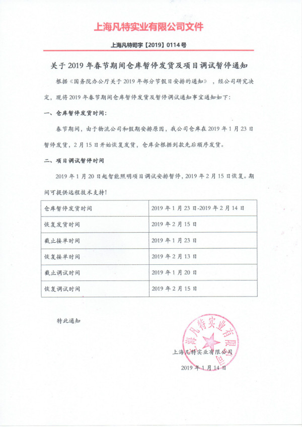 2019年春節(jié)期間暫停發(fā)貨、調(diào)試通知