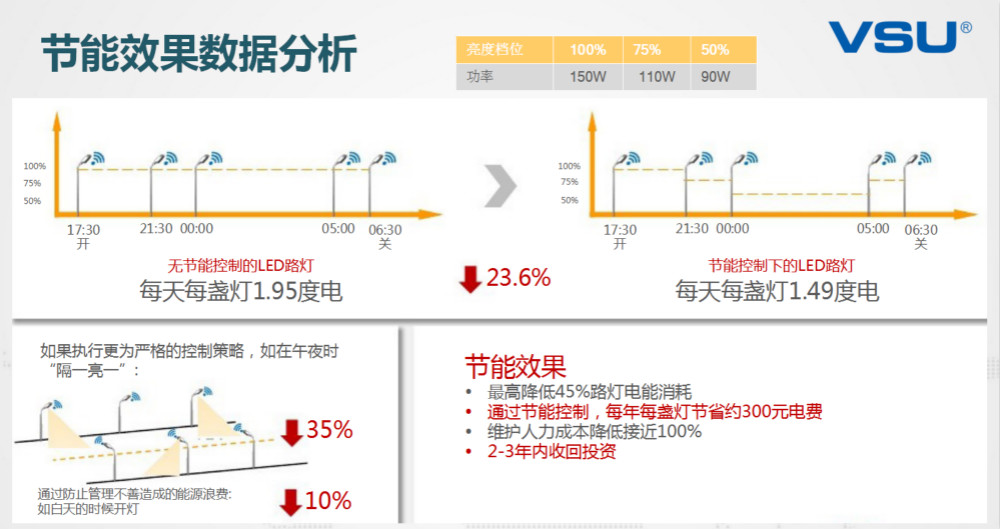 VSU依托公司在單燈控制器、集中控制管理器和硬軟件系統(tǒng)集成開(kāi)發(fā)能力,成功開(kāi)發(fā)VSU智慧路燈。VSU智慧路燈具有以下特點(diǎn):